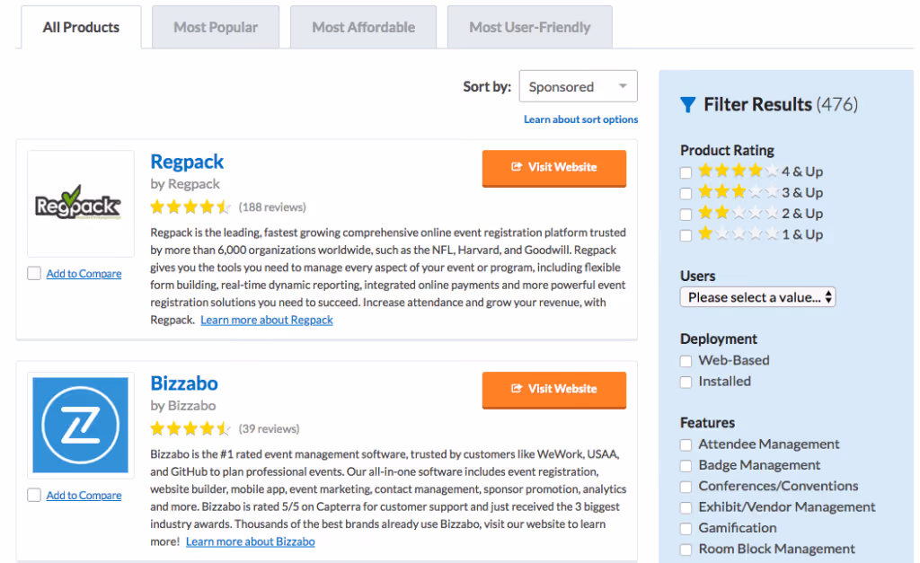 - The Event Software Buyers Guide (Bizzabo): By aggregating reviews from third-party data platforms like Capterra and G2Crowd, we compiled an objective report of the top event marketing platforms on the market.