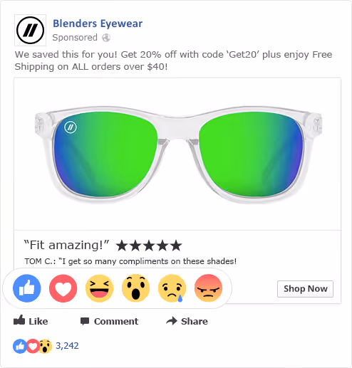 Blenders Eyewear seamlessly blend reviews and star ratings into their ads using Facebook's Dynamic Product Ads format. Not only does this mean they're targeting shoppers who have already shown an interest in their products, but they take it one step further and add a persuasive dose of social proof to help buyers validate their choice.