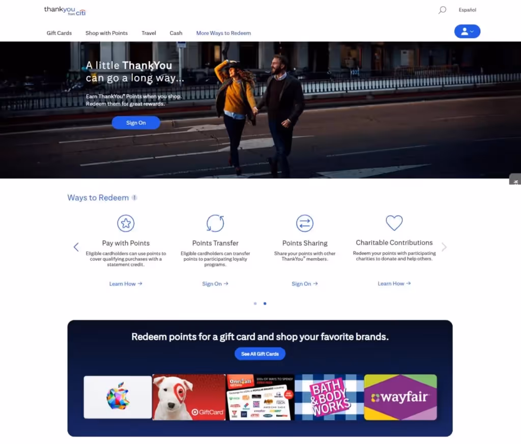 Citi's ThankYou Rewards program allows customers to earn points on everyday banking activities as well as credit card purchases, redeemable for a wide variety of rewards, including travel, merchandise, gift cards, and even cash back.