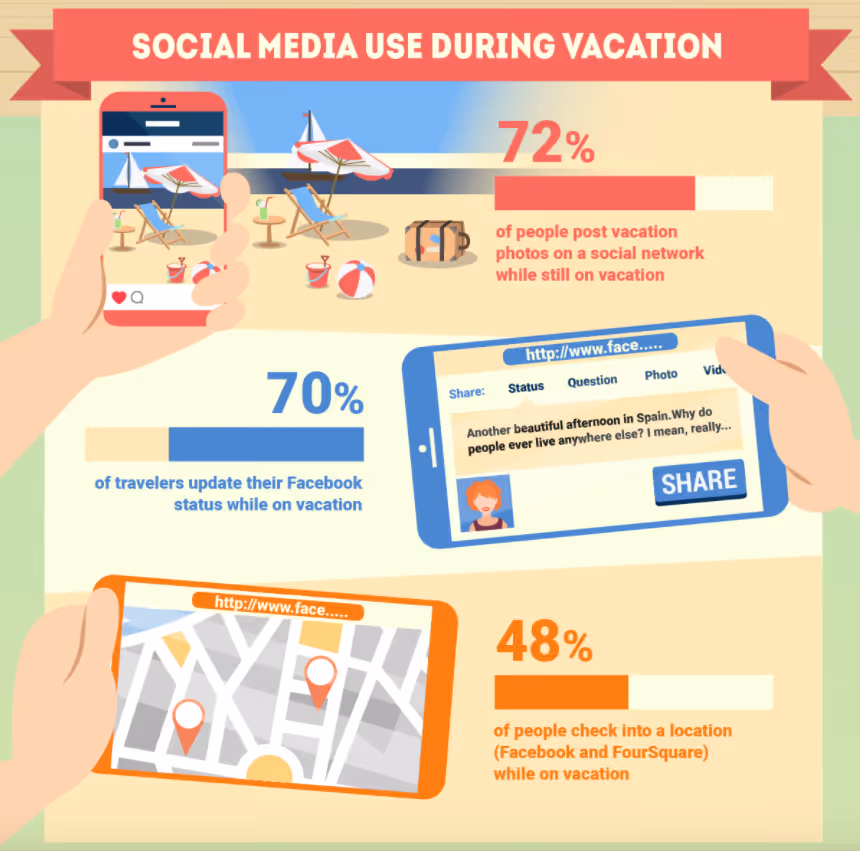70% of Facebook users update their status when they're on holiday - it makes sense, because this is the “fun” side of their life, and everyone likes to share the best version of themselves on social media.