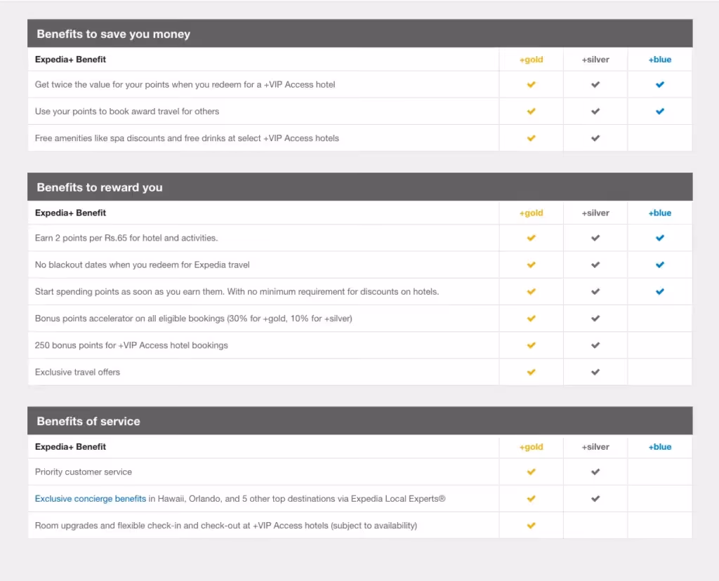 Expedia+ has new loyalty tiers that allow high spenders to receive additional privileges. Free Expedia+ membership automatically gives users +blue status, followed by +silver status after they spend $5,000 on eligible bookings or stay 7 qualifying hotel room nights, and +gold status after they spend $10,000 on eligible bookings or stay 15 qualifying hotel room nights. Loyalty program benefits are divided into three categories.