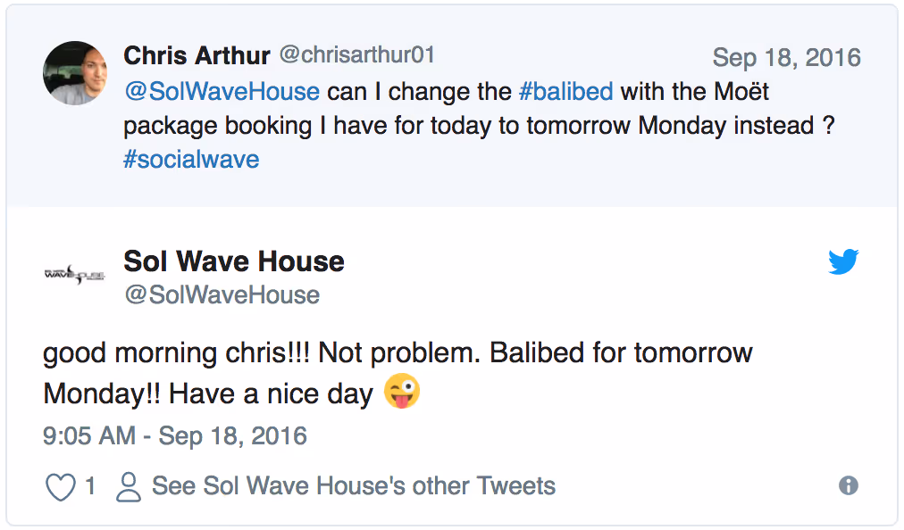 In fact, they've gone so far as to operate the entire hotel through hashtags. There are Twitter-themed rooms, social media inspired cocktails, and the ability for guests to do anything and everything by Tweeting, which is kind of like the hotel's in-house currency.This integration of social media into the guest experience has led to a huge increase in interaction on Twitter around the core hashtag, #SocialWave, as well as smaller, more niche hashtags, like #poolbarorder, which lets guests order a round of drinks from the comfort of their sun lounger.