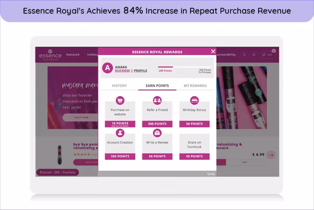 A practical example of this is Essence Royal's implementation of loyalty rewards. They achieved 84% increased repeat purchase revenue within three months of implementing the loyalty program. Customers can earn points by referrals, account creation, sharing on Facebook, and purchases across a wide range of cosmetics. They were able to reduce discounts. Replace discounts with reward points promotions.