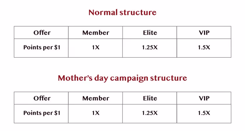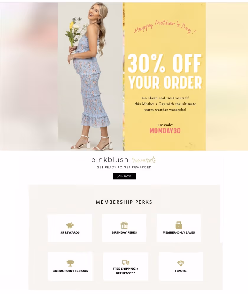 PinkBlush Maternity is the one-stop shop for stylish and trendy maternity clothing for the modern mother. They actively launch interesting campaigns around special days to connect with new and soon to be moms in their PinkBlush Rewards Program. A recent campaign launched by them for Mother's Day where they offered more points per dollar spent to the members of different tiers.