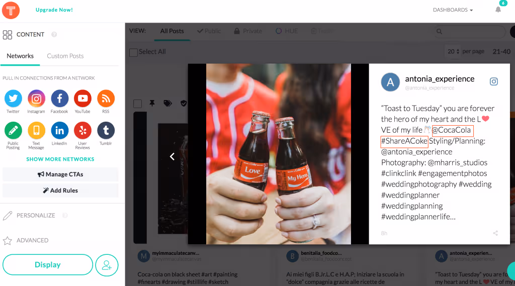 For example, if your brand was Coca Cola, and you were running a campaign whose hashtag was #ShareACoke, your followers would need to include BOTH @CocaCola and #ShareACoke for you to be able to access that content as a marketer.