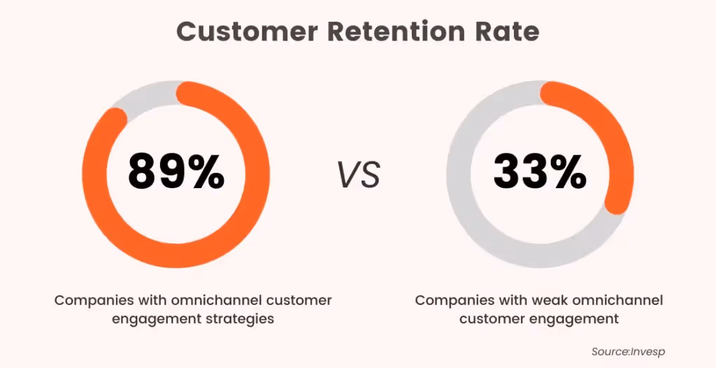It is noteworthy that companies implementing omnichannel customer engagement strategies experience a significantly higher customer retention rate. On average, these businesses retain 89% of their customers, in stark contrast to the 33% customer retention rate observed among companies with inadequate omnichannel strategies.