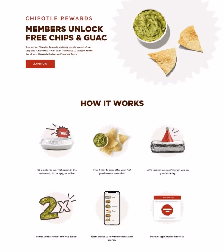 ‘Chipotle Rewards' is one of the best restaurant loyalty programs. It engages customers at multiple touchpoints and provides them with a plethora of goodies, making the program truly fulfilling and appealing. Customers earn 10 points for every $1 spent at Chipotle and can simply download the Chipotle app or create an account to engage with the rewards program. Rewards can be earned in the restaurant, online, through pickup, delivery or “Chipotlane”. Engaging the customers from their very first purchase, Chipotle Rewards offers free chips & Gauc after their first purchase as a member. The program offers exclusivity as customers get extra perks on their birthday, 2X bonus points, early access to new menu items and swag etc. The interesting and exciting part of Chipotle Rewards is its redemption options.