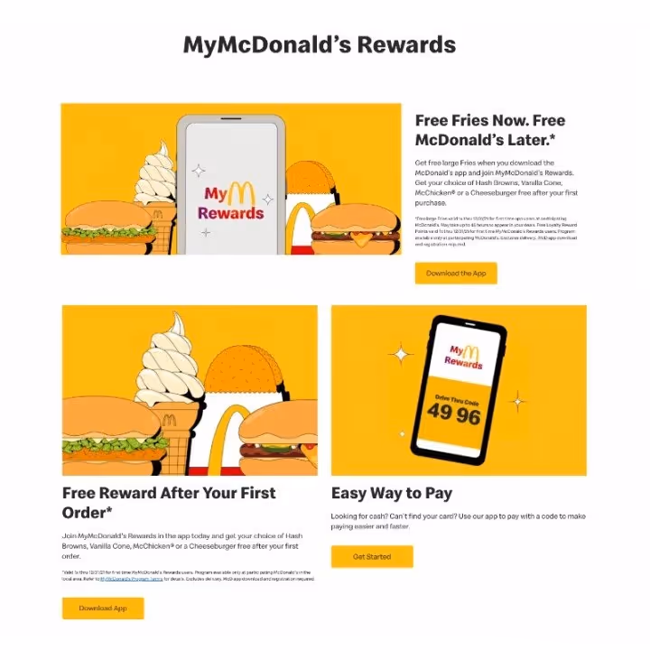 There is doubt that food rewards programs can fuel more frequent visits, increase average order value, and offer restaurants valuable insights about consumers. McDonald's recently launched their MyMcDonald's Rewards program that allows customers to earn 100 points for every dollar they spend. Customers enjoy free large fries when they download the McDonald's app and join the rewards program. This delicious freebie instigates customers to download the app, a brilliant strategy embedded by McDonald's in their loyalty program. After the first order, customers can get their choice of hash browns, vanilla cone, McChicken or a cheeseburger for free. Using the McDonald's app to order food racks up points, which can be exchanged later for free menu items.